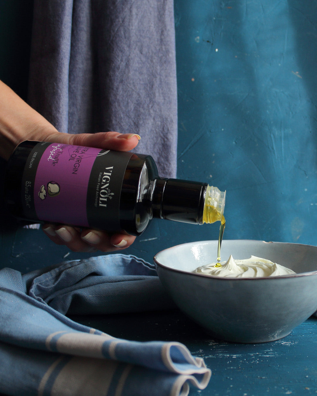 - Meanwhile, mix the cream cheese with Vignoli White Truffle Infused Extra Virgin Olive Oil. Add a splash of milk if needed to make it softer and creamier.