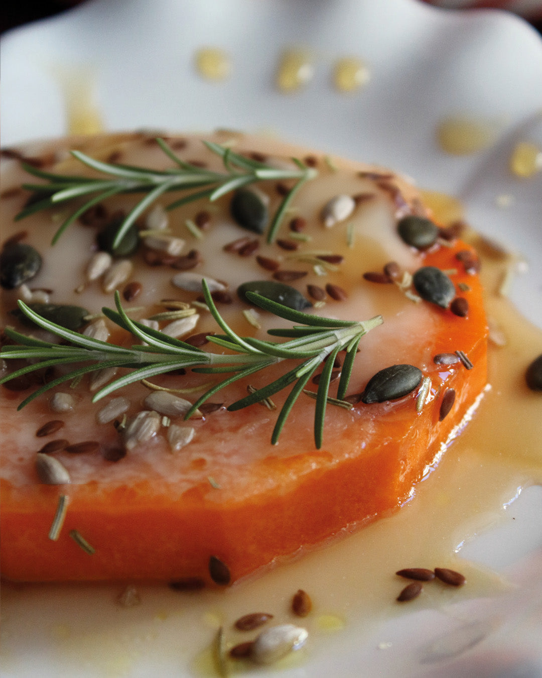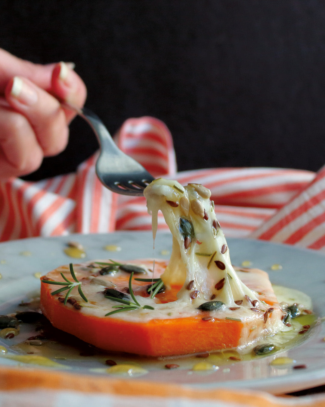 - Take the dish out of the microwave. Place the cheese slices on top of the pumpkin medallions, then drizzle with a bit of honey and sprinkle with mixed seeds and rosemary.