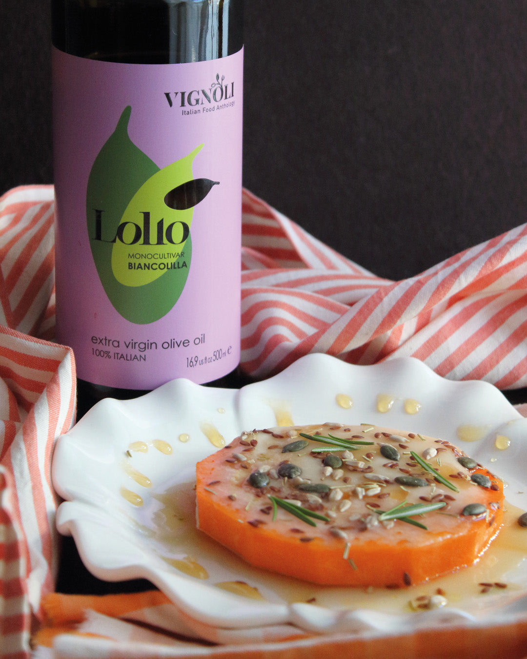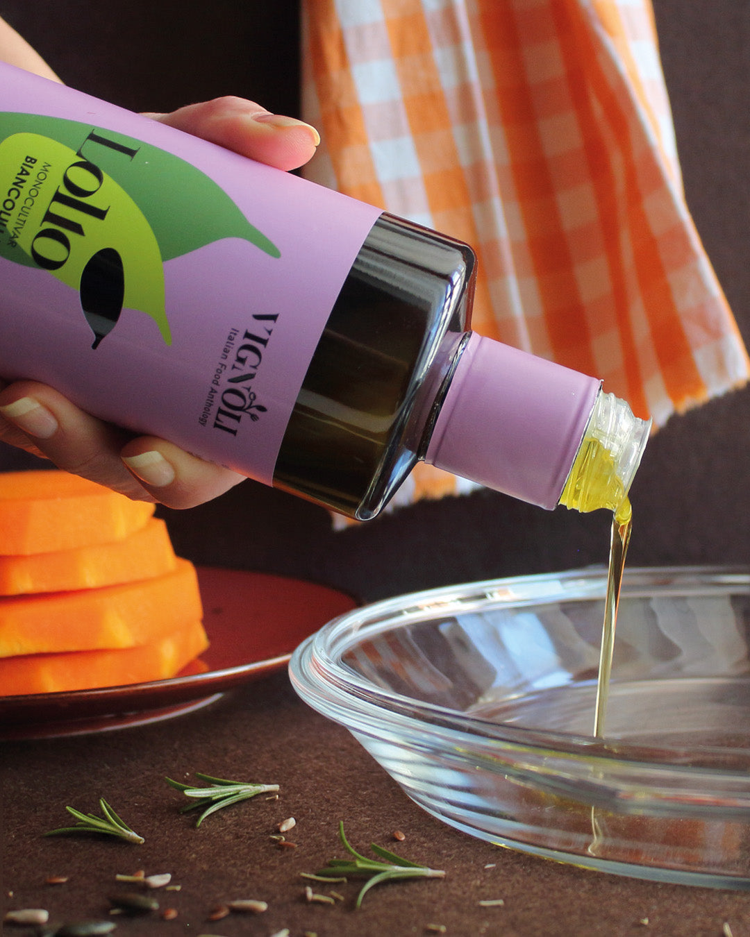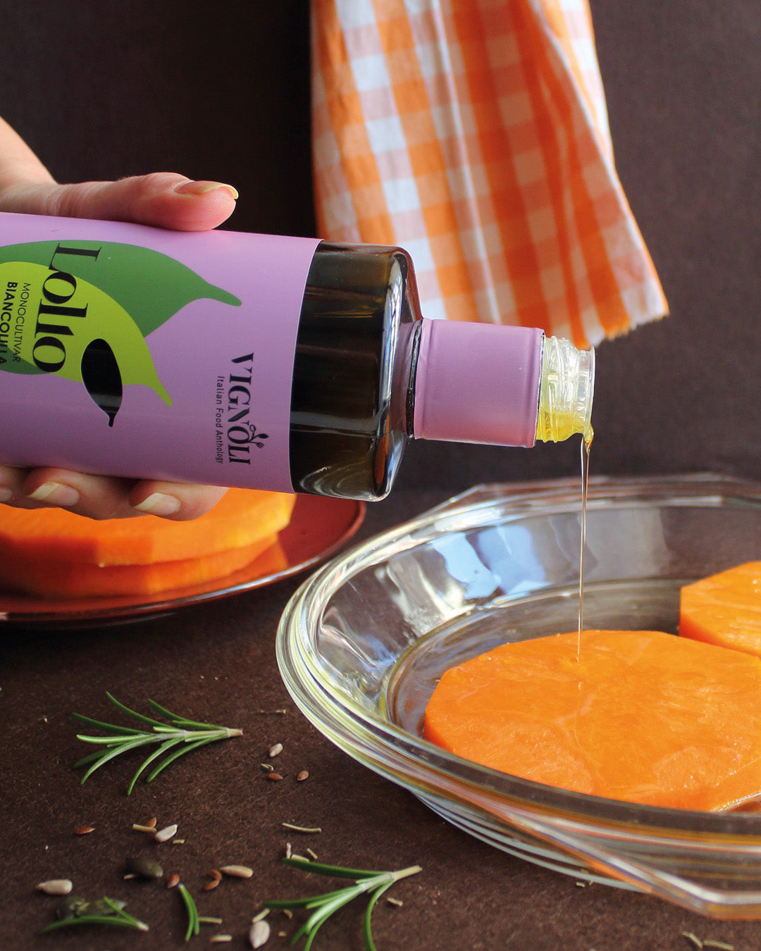 - Arrange the pumpkin slices in the dish and brush them with the remaining 2 tablespoons of Vignoli Biancolilla Monocultivar Extra Virgin Olive Oil. Microwave at 650W for 5 minutes.