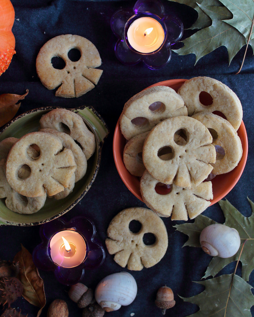 - Preheat the oven to 350°F (180°C) using the static (conventional) setting. On a floured surface, roll out the dough to about ½ cm (¼ inch) thick. Cut out the cookies with a skull-shaped cookie cutter, or use a round cutter for the head, a piping tip for the eyes, and a wooden skewer to create the teeth and nose holes.